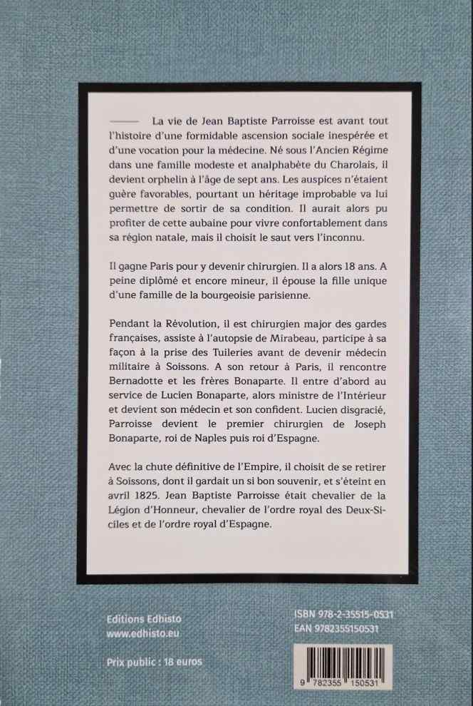 La vie de Jean Baptiste Parroisse est avant tout l’histoire d’une formidable ascension sociale inespérée et d’une vocation pour la médecine. Né sous l’Ancien Régime dans une famille modeste et analphabète du Charolais, il devient orphelin à sept ans. Les auspices n’étaient guère favorables, pourtant un héritage improbable lui permet de gagner Paris pour y étudier la chirurgie. Pendant la Révolution, il est chirurgien major des gardes françaises, assiste à l’autopsie de Mirabeau, participe à sa façon à la prise des Tuileries avant de devenir médecin militaire à Soissons. A son retour à Paris, il rencontre Bernadotte et les frères Bonaparte. Il entre d’abord au service de Lucien Bonaparte, alors ministre de l’Intérieur et devient son médecin et son confident. Lucien disgracié, Parroisse devient le premier chirurgien de Joseph Bonaparte, roi de Naples puis roi d’Espagne. A la chute de l’Empire, il choisit de se retirer à Soissons, dont il gardait un si bon souvenir.