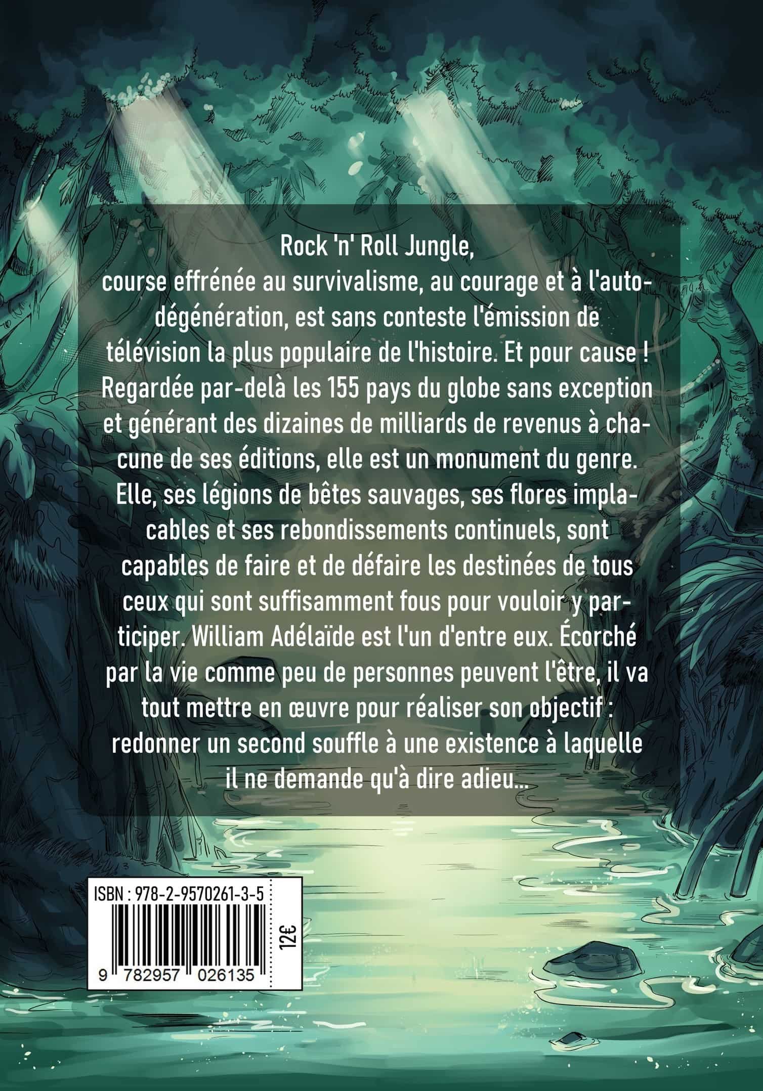 Rock ‘n’ Roll Jungle, course effrénée au survivalisme, au courage et à l’auto-dégénération, est sans conteste l’émission de télévision la plus populaire de l’histoire. Et pour cause ! Regardée par-delà les 155 pays du globe sans exception et générant des dizaines de milliards de revenus à chacune de ses éditions, elle est un monument du genre. Elle, ses légions de bêtes sauvages, ses flores implacables et ses rebondissements continuels, sont capables de faire et de défaire les destinées de tous ceux qui sont suffisamment fous pour vouloir y participer. William Adélaïde est l’un d’entre eux. Écorché par la vie comme peu de personnes peuvent l’être, il va tout mettre en œuvre pour réaliser son objectif : redonner un second souffle à une existence à laquelle il ne demande qu’à dire adieu…