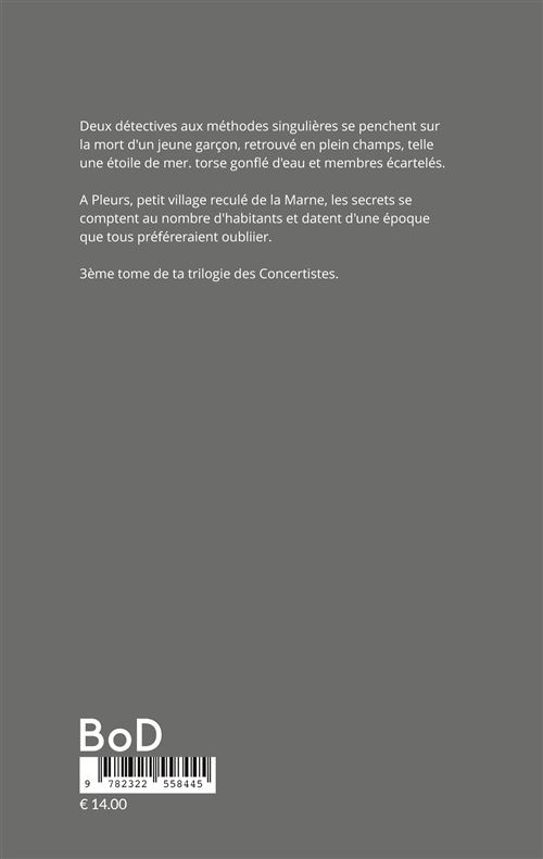 Deux détectives aux méthodes singulières se penchent sur la mort d’un jeune garçon, retrouvé mort en plein champ, telle une étoile de mer. Torse gonflé d’eau et membres écartelés. À Pleurs, petit village reculé de la Marne, les secrets se comptent au nombre d’habitants et datent d’une époque que tous préféreraient oublier. La nouvelle enquête des « Concertistes » dévoile une foule de protagonistes comme un kaléidoscope de la tragédie humaine et des deuils engendrés par l’infamie du monde.